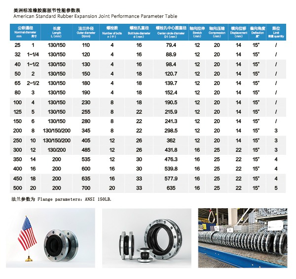 www.17c.com(jiāng)减震器集团(tuán)有限公司网站为您介绍:【ANSI】DN100美标橡胶膨胀节信(xìn)息(xī),www.17c.com集团为众多客户提供美(měi)标型(xíng)橡胶管接(jiē)头产品(pǐn),主(zhǔ)要采用美标150LB法兰标准(zhǔn),橡胶采(cǎi)用长度(dù)130mm标准,具有(yǒu)良(liáng)好的减震和(hé)降噪(zào)效果。
